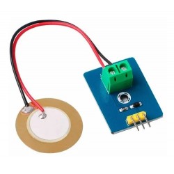 Un sensor piezoeléctrico, dispositivo que responde a las vibraciones, produce una tensión en respuesta a una acción física. El piezo se polariza y el lado positivo se conecta a una entrada analógica, el lado negativo se conecta a tierra. La tensión es detectada por Arduino usando analogRead.